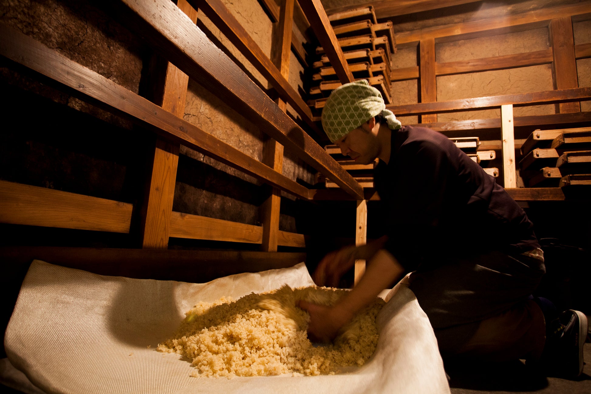 杵(きね)と臼(うす)を使い、職人が手作業で仕込みます。木桶で12ヶ月間じっくり自然発酵させました。生きた麹の香り豊かな味わい深い「生味噌」です。